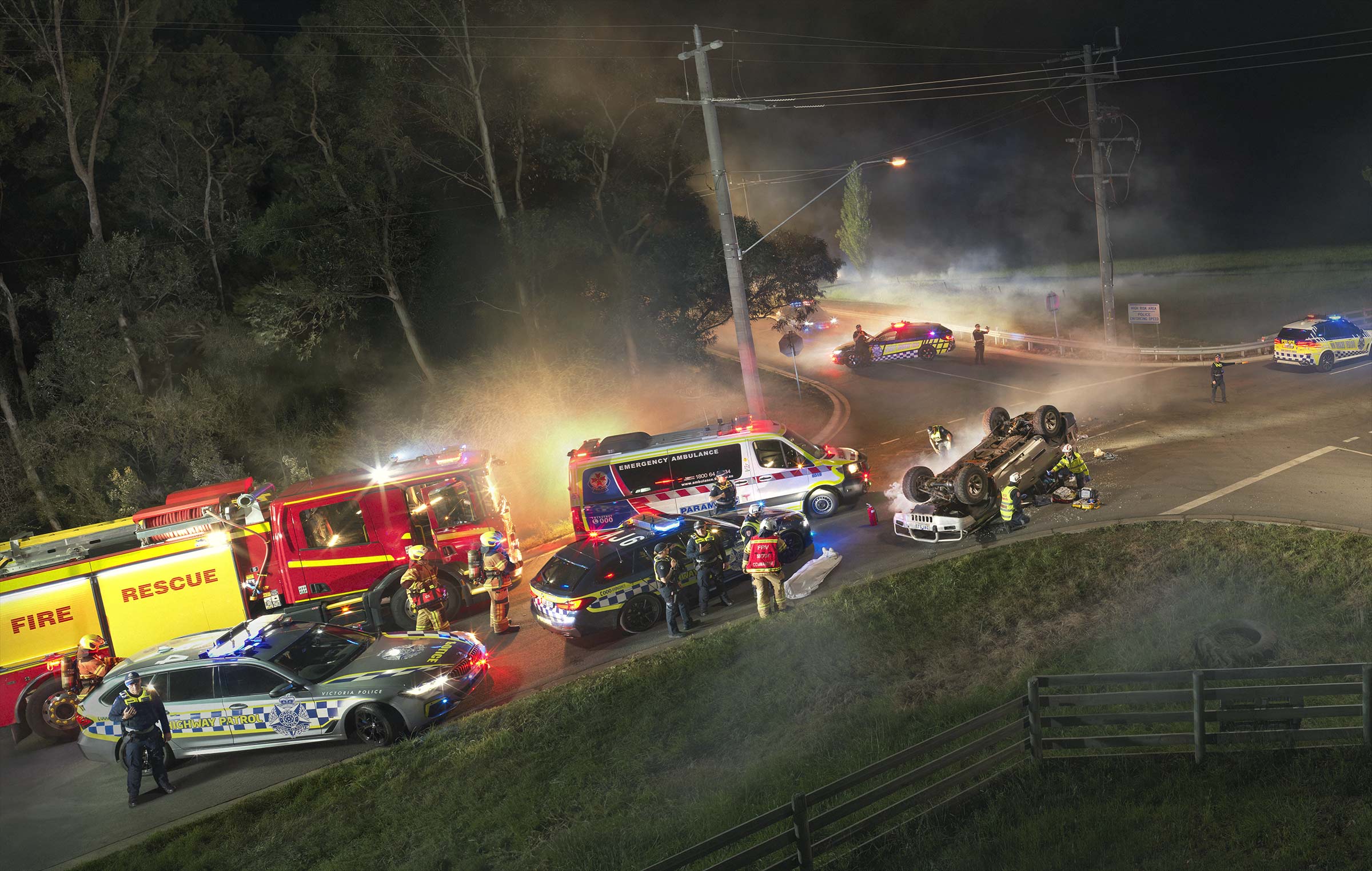 We shut down the road, worked through the night and built the entire scene in camera. Emergency services, vehicles, lighting, atmosphere, talent, all happening live. No shortcuts, no pretending.