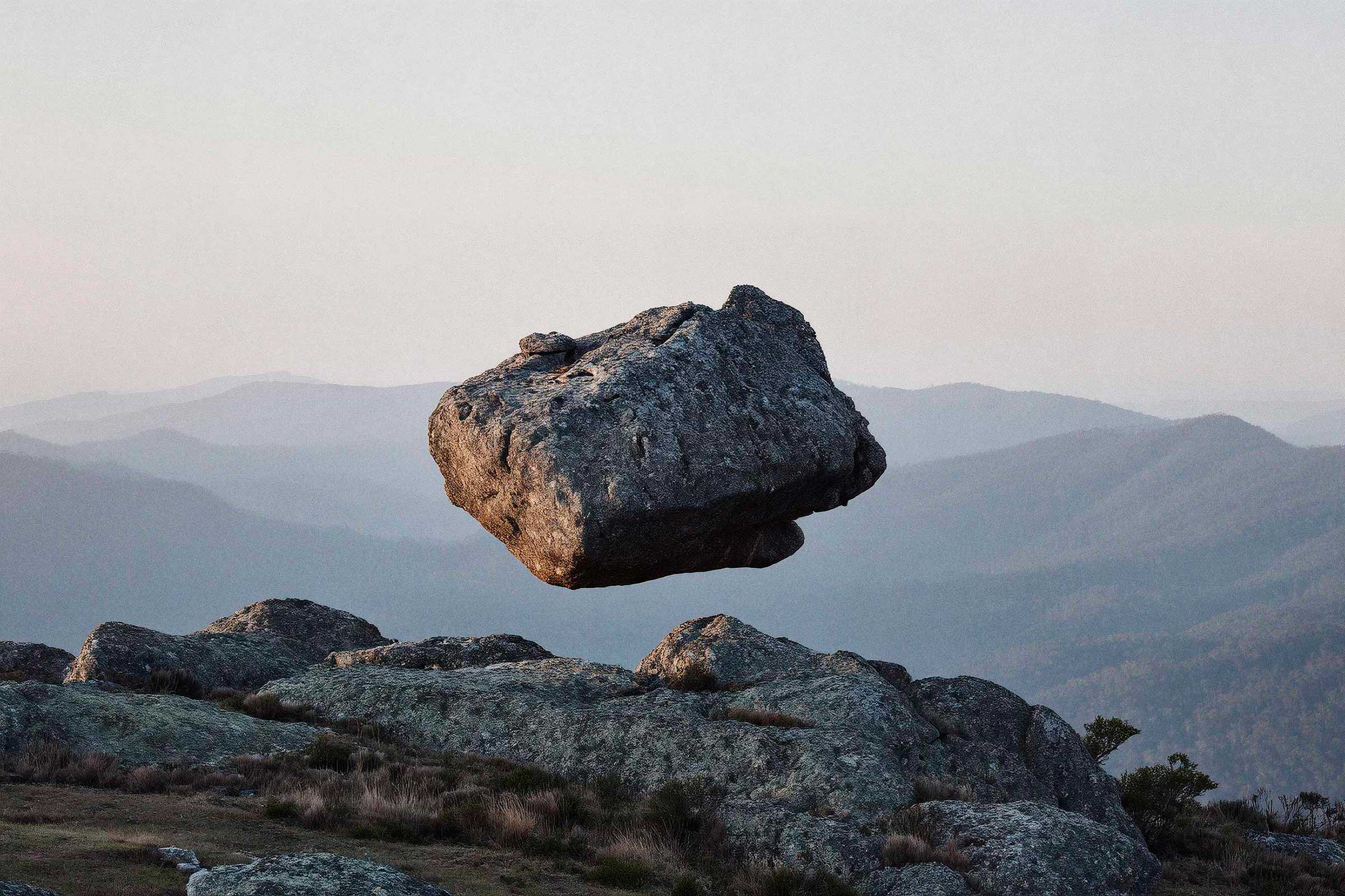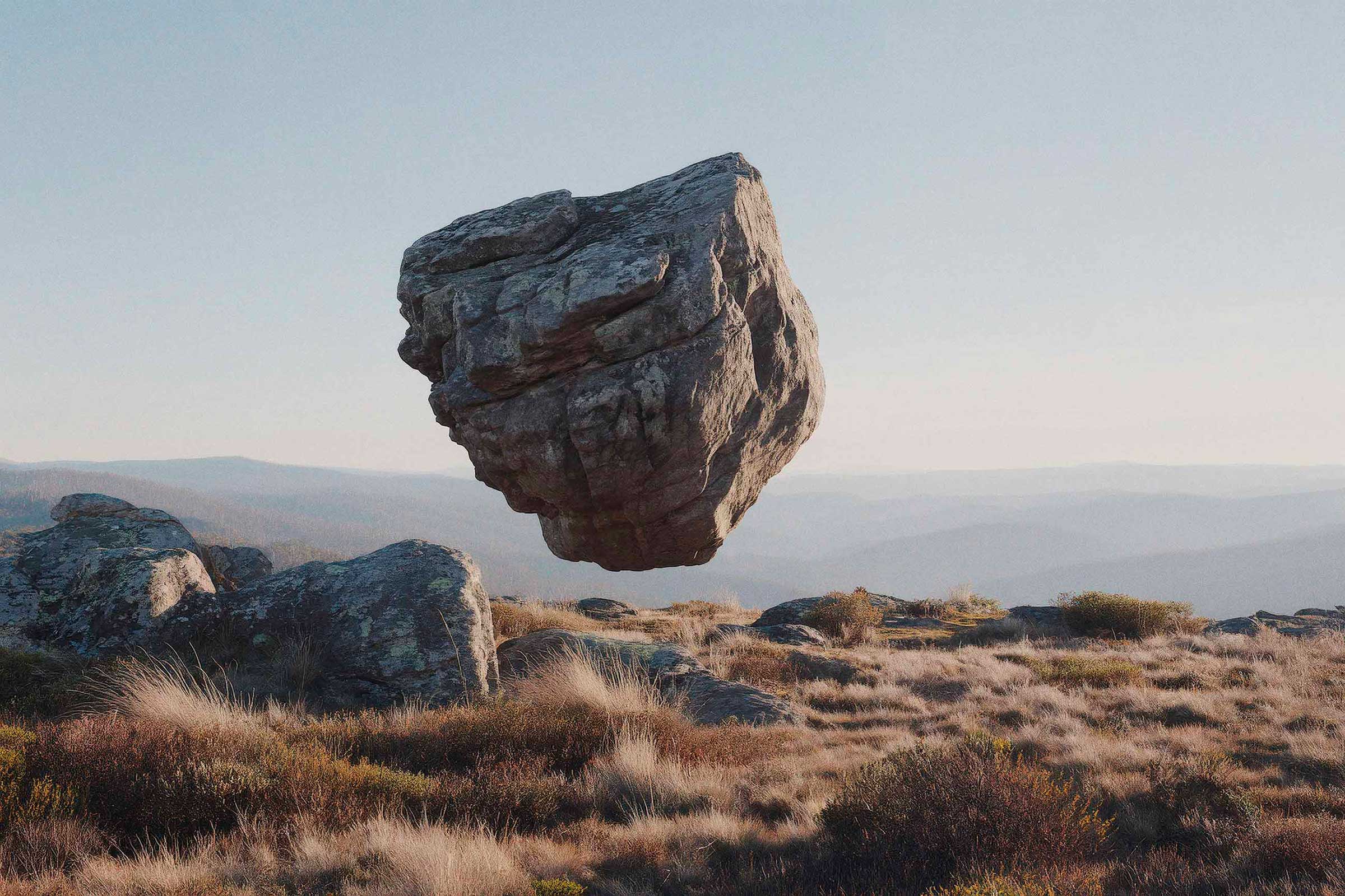 The boulders carry weight, and yet there’s a strange lightness to it. A calmness. It would be easy to make them move, turn it into motion. But they don’t need to. The idea holds in a single frame.